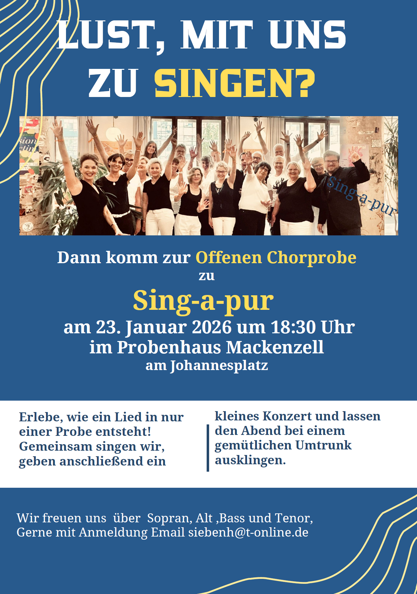 Wir sind der Chor Sing-a-pur aus Hünfeld-Mackenzell. Unser Repertoire geht von aktuellen Songs aus dem Pop & Rock Genre bis zu Evergreens. Natürlich haben wir auch Advents- und Weihnachtslieder auf der Liste. Unter der Leitung von Lukas Kout proben wir jeden Freitag um 18:30 Uhr in unserem Probenraum am Johannesplatz in Hünfeld-Mackenzell.